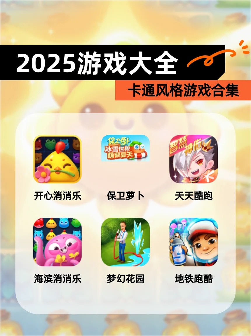 【2025游戏大全】卡通风格游戏合集1 【开心消消乐】是一款超级治愈的三消游戏,消除烦恼,收获快乐!2 【保卫萝卜】中你要通过塔防来保护可爱的萝卜,策略和可爱并存!3 【天天酷跑】是一款刺激无比的