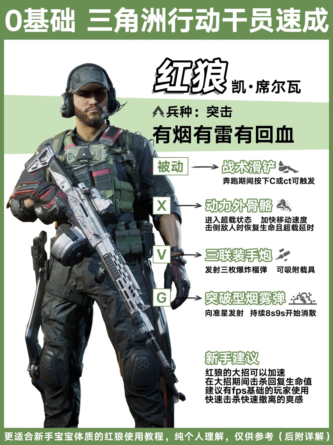 红狼速成教学——三角洲行动新手指南本篇指南旨在为新手玩家提供红狼角色的快速入门知识,帮助大家更好地掌握这位全能突击干员。红狼概览别称:寻血猎犬、红狗定位:全能突击位特点:配备烟雾弹、手雷,拥有回