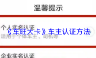 《车旺大卡》车主认证方法 打开车旺大卡,点击底部导航栏最右侧的“我的”选项,进入个人界面后,在头像区域下方找到并点击“车主认证”,在弹出提示框中选择“个人实名认证”,接着输入真实姓