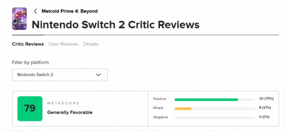 备受期待的《银河战士Prime 4:超越》媒体评分于12月2日正式解禁。根据评分聚合网站Metacritic数据显示,本作目前基于38家媒体评价获得79分的平均分。其中30家媒体给出正面评价,8家给出中评,尚无媒体给出差评,显示出作品整体获得了业界的广泛认可。