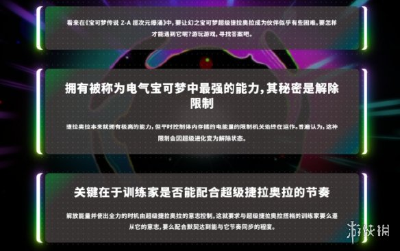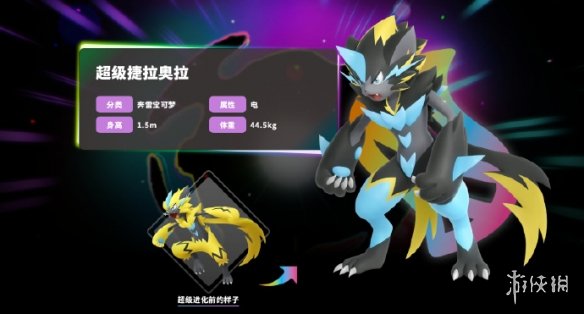 在《宝可梦传说:Z-A》中,它是一只幻之宝可梦,无法通过进化获得,通常需要通过特殊活动获取。超级捷拉奥拉被归类为"雷击宝可梦"。常态下的捷拉奥拉体内有一个"限制器"来约束其庞大的电能,而超级进化会解除这个限制器,让它能释放全部力量。其体内储存的电能相当于十道落雷,一旦释放,足以一次性打倒周围所有的对手。
