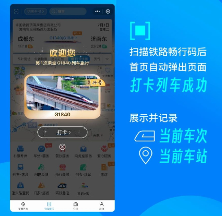 据介绍,足迹打卡功能分为列车打卡和车站打卡两种形式。列车打卡会记录旅客所乘列车的车次、日期、乘坐总数及比例,以及车型的详细信息;