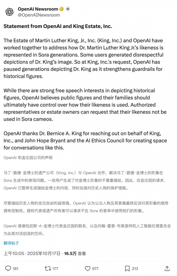 OpenAI在其官方X账号发文强调:“尽管对历史人物的描绘涉及言论自由范畴,但公众人物及其家属应当拥有对其肖像的最终控制权。授权代表或遗产管理人有权要求Sora停止将其肖像用于‘客串’场景。”