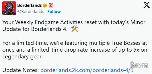 作为年终小规模更新,Gearbox还在游戏中同步启用了三位终极返场BOSS,持续开放至1月8日,让《无主之地4》开发团队能安心享受假期。每周首领轮换与周四周常活动更新将于1月8日恢复正常。Gearbox表示,在新年团队复工前,周常活动将维持当前状态不变。考虑到2026年《无主之地4》的庞大更新计划,开发团队确实需要适当休整。