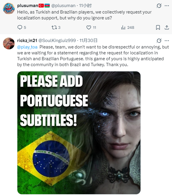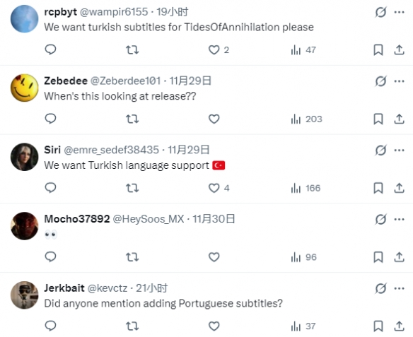 一个有趣的现象是,《湮灭之潮》每条官推下方,几乎都被国际玩家“请求上线本地语言”的评论强势刷屏。尤其是巴西和土耳其的玩家最为执着,他们成群结队、倔强“复读”,把评论区变成了为本国语言请愿的“每日打卡”地。