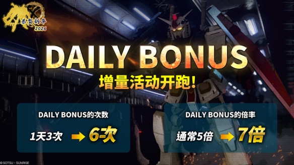 万代南梦宫娱乐今日宣布, PlayStation®5/PlayStation®4用在线游戏「机动战士高达 激战任务2 」(以下《激战任务2》) ,将于2026年1月1日(四) 14:00起,举办『恭贺新年2026』活动。
