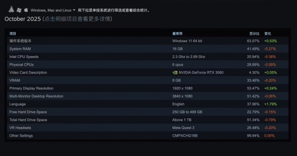 硬件配置方面,英伟达RTX 3060桌面版以4.3%的占比(下降0.32个百分点)保持Steam最受欢迎显卡地位,笔记本版RTX 4060以4.1%(下降0.33个百分点)紧随其后,RTX 3050则以2.96%(上升0.05个百分点)位列第三。主流配置仍集中在16GB内存、6核CPU、8GB显存及1080p显示屏的组合。