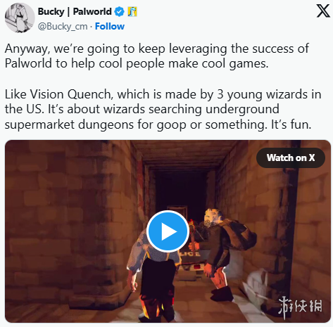 Pocketpair传播总监兼发行经理约翰·巴基·巴克利在推特上表示:"我们将持续借助《幻兽帕鲁》的成功,助力优秀开发者打造精彩游戏。"他特别强调了公司正在发行的合作射击游戏《Vision Quench》:"这款由三位美国年轻程序员打造的作品,讲述巫师们在地下超市迷宫中搜寻粘稠物质的奇幻冒险,趣味性十足。"