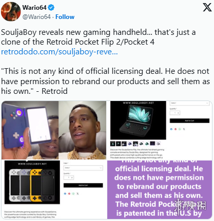 复古掌机品牌Retroid近日针对美国说唱歌手Soulja Boy涉嫌换标销售其产品的行为发表正式声明,明确表示从未授权其使用相关设计。这已是该歌手第三次因游戏硬件产品陷入侵权争议。