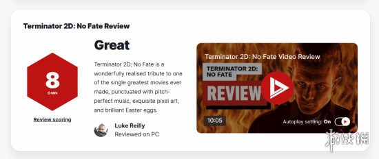 IGN在评测《 终结者2D:NO FATE 》后,给出了8分的评价。评测认为,这款游戏是对影史经典《终结者2》的一次出色致敬。其出色的像素美术、完美的配乐,以及各处精心设置的彩蛋,共同构成了这段精彩的体验。