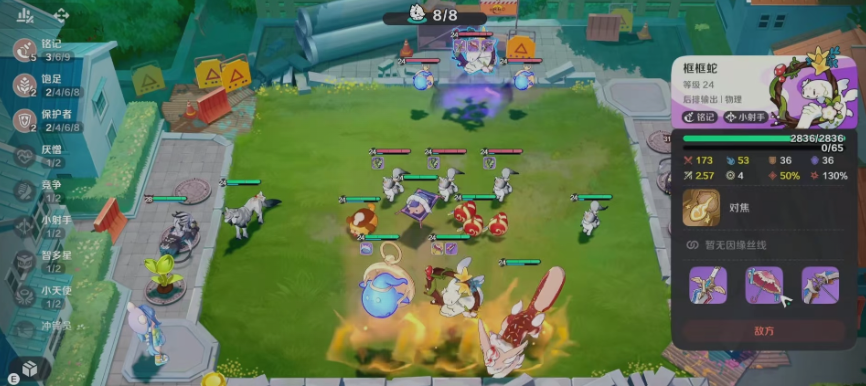 如果框框蛇跟攻击目标之间的距离大于两格的话,那么后期会有一定的加成可以进行提升,所以像框框蛇继续输出的话,远程能力会更高一些。如果大家想要用它更多能力的话,这里的羁绊是一定要触发的,它能够达到8羁绊效果的时候,能力会有很大百分比的提升,比如这里攻击力上面就会有40%的提升,除了攻击加成之外,还有额外的百分之百在属性上面有一定的提升,技能方面要用他的技能,最好的就是使用对焦效果,因为他使用这个技能之后,会找到目前离他最近的一个敌方单位,然后对这个敌方单位造成物理类型的伤害,此时的伤害是利用他的能量能量弹来造成输出之外,他在释放了能量大输出之后,还会给自身带来一定的强化。