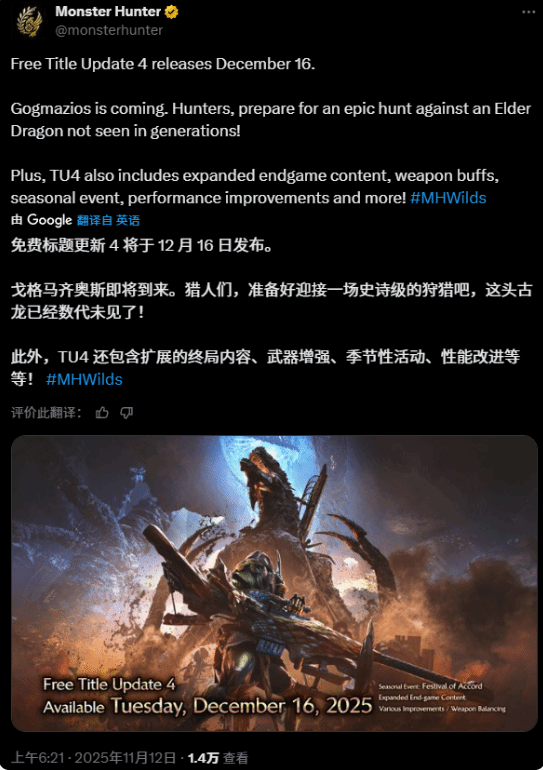 4.《怪物猎人:荒野》第四次大型更新将于12月16日上线!