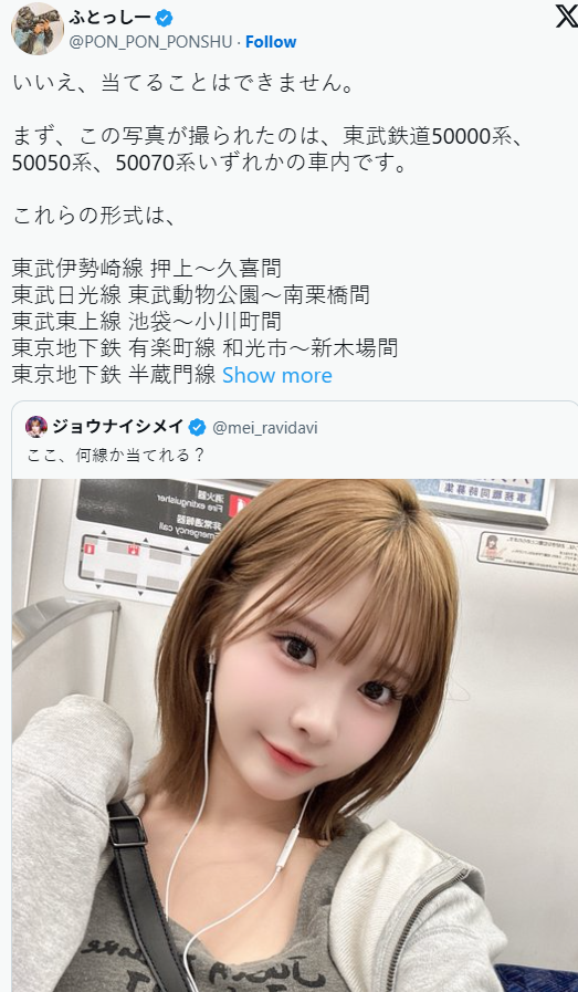 电车爱好者ふとっし一(@PON_PON_PONSHU)接题后,迅速展开层层剖析。他首先根据车厢内装,判定照片拍摄于“东武50000系列(含50050/50070系)”列车。该系列列车会出现在包括东武伊势崎线、东京Metro有乐町线、东急田园都市线等在内的9条线路上。