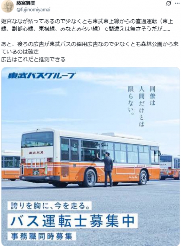 与此同时,其他网友也加入“破案”行列,指出照片中出现了东武铁路宣传看板娘“姬宫なな”的贴纸,这是仅出现在“东武东上线直通列车”上的标志。加之车厢后方的“东武巴士招募广告”更常见于东上线沿线,使得推理结果进一步聚焦于副都心线、东横线及其直通区间。