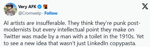 在X平台上,道斯发表犀利评论,痛斥那些以为向算法机器人输入提示词就具有创造力的人群。"AI艺术家令人无法忍受,"他尖锐指出,"他们自诩为后现代叛逆者,但他们在推特上发表的每一个观点,早在上世纪10年代就被某个坐在马桶上的人说尽了。至今未见任何超越领英复制粘贴内容的新思想。"