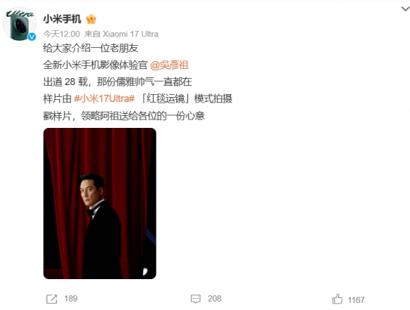 今日,小米手机官方在微博宣布,吴彦祖正式担任小米手机影像体验官。同时,官方公布了由小米17 Ultra“红毯运镜”模式拍摄的吴彦祖官宣短片。