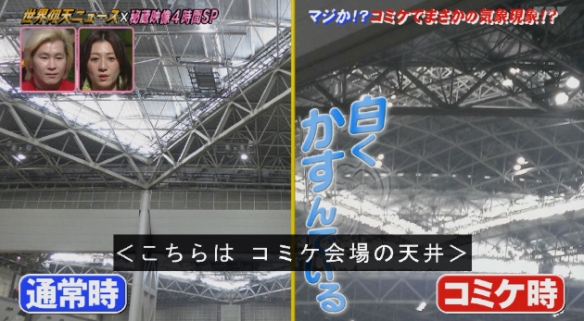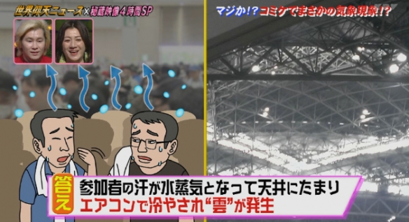 “Comiket云”是指在夏季Comiket会场内,由于人流密集、汗水蒸发,常在屋顶附近形成类似薄云的现象,被戏称为Comiket的独特景观。即便在冬季,若现场人流足够密集,也可能出现这一现象。