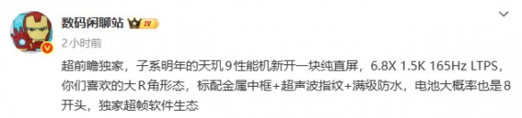 据数码博主@数码闲聊站 最新爆料,一款定位中高端的子系新机有望搭载多项旗舰级配置。据悉该机型将配备6.8英寸1.5K分辨率直屏,支持165Hz超高刷新率并采用LTPS技术,结合网友推测,其或为红米明年将推出的Redmi K90至尊版。