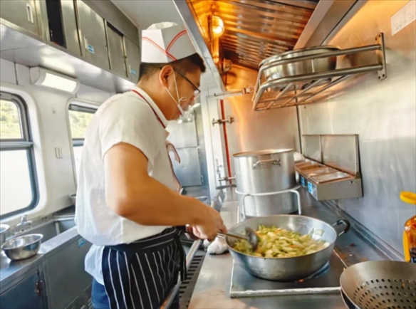 在绿皮火车这个“移动灶台”上,厨师们更是练就了一套独门绝技——能够在列车晃动中精准掌勺,每一道工序都随着列车行进的节奏顺利完成。