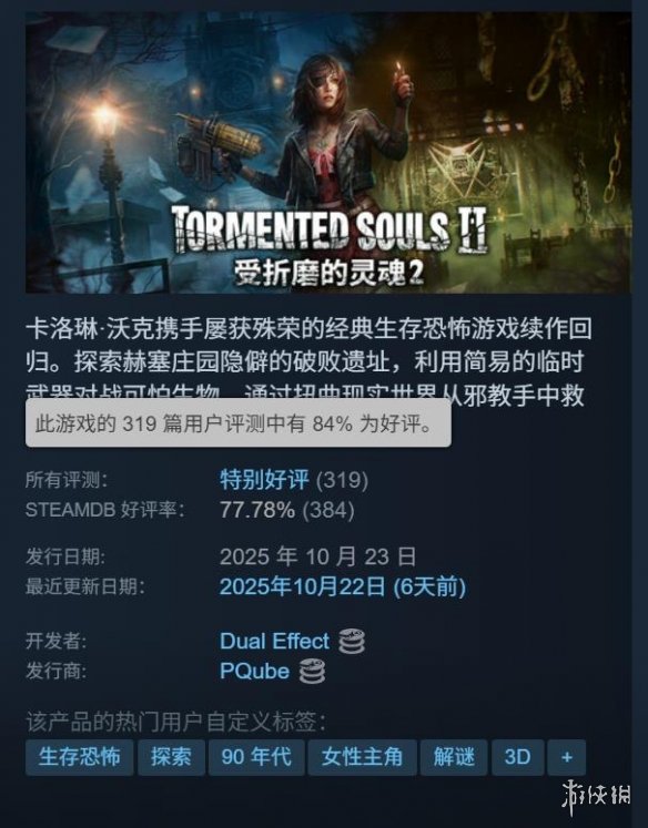 复古生存恐怖射击游戏《受折磨的灵魂2》已于10月23日正式登陆PC、PS5及Xbox Series X|S平台。该游戏在Steam国区定价为108元,首发期间享有9折优惠,折后价格为97.2元。截至目前,本作在Steam共收录319份评价,总体好评率达84%,评价为“特别好评”。