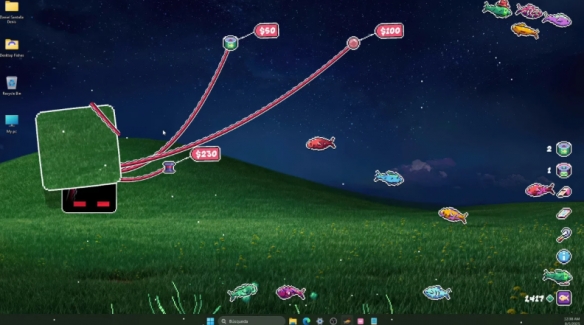 本作最具特色的当属丰富的装饰系统。来自神秘触手卖家的各种搞怪道具,包括太阳镜、武器、帽子等都可以装备在鱼身上,创造扛着AK47戴墨镜的滑稽形象。这种极致反差萌的设计,成为游戏最大的治愈亮点。
