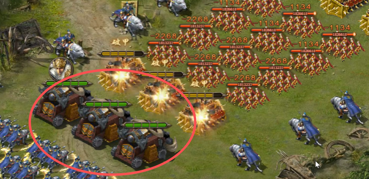 那么在兵种里面有比较特殊的一类效果,就是攻城车,攻城车的话目前在游戏当中属于兵种当中的一类特殊道具,在游戏当中可以在攻城里面为大家带来足够破防的效果,所以也算作是一类特殊兵种,大家使用这类攻城车的时候要注意他们的特点就是有足够的破防,但是自身的移动能力是不太够的,玩起来是比较笨拙,但是他们自身也有一定的防御,就是不能被敌人围攻,如果被敌人围攻的话,他可能还没有到城门下就直接散架了,而且比较怕一些远程的输出,所以大家在攻打敌方城池的时候,使用攻城车要注意,前方要是有盾兵的话,先放一些盾兵,然后第二排再放工程车,而且工程车是比较受对面弓兵克制的,所以在这里玩儿工程车的时候就要注意这一点是他的弱点。