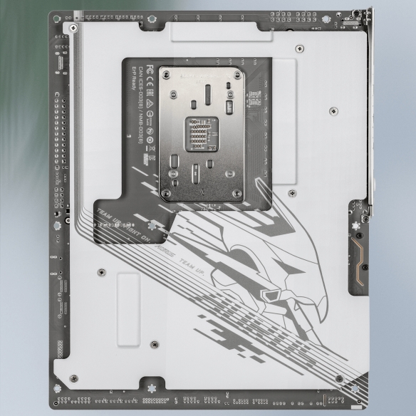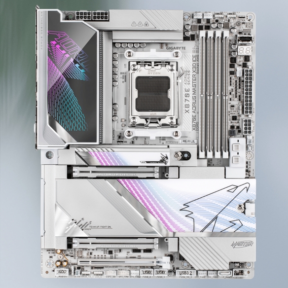 预算拉满的高端玩家看过来!870E AORUS MASTER X3D ICE 超级冰雕作为 X870E AORUS PRO X3D ICE 电竞冰雕的高阶版本,在外观设计上保持了高度的一致性,以纯粹的白色为主基调,紧扣 “冰系” 主题的清冷美学。两者的核心差异集中在机身装饰上:超级冰雕采用了更大范围的镭射纹理覆盖,细腻的纹路搭配璀璨的光泽,不仅让整机质感得到显著提升,更赋予了它独特的视觉张力,使其在众多板卡中显得格外亮眼,轻松成为装机方案中的颜值担当。