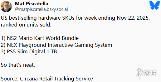 据Circana高级总监马特·皮斯卡泰拉报告,截至11月22日当周美国游戏机销量冠军是任天堂Switch 2的《马里奥赛车世界》同捆套装——鉴于该主机近期发售即大获成功,这个结果并不令人意外。但紧随其后的销量亚军却出人意料,既非Xbox系列也非PlayStation系列,而是Nex Playground。季军则为PS5 Slim数字版,"这很有意思,"他表示。