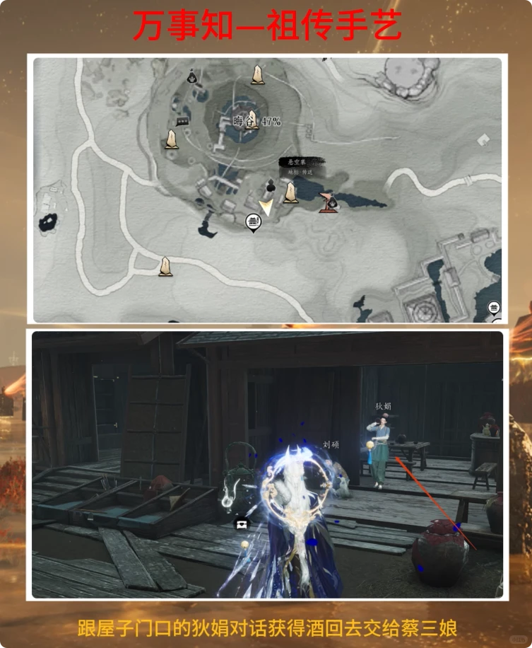 跟屋子门口的狄娟对话获得酒回去交给蔡三娘