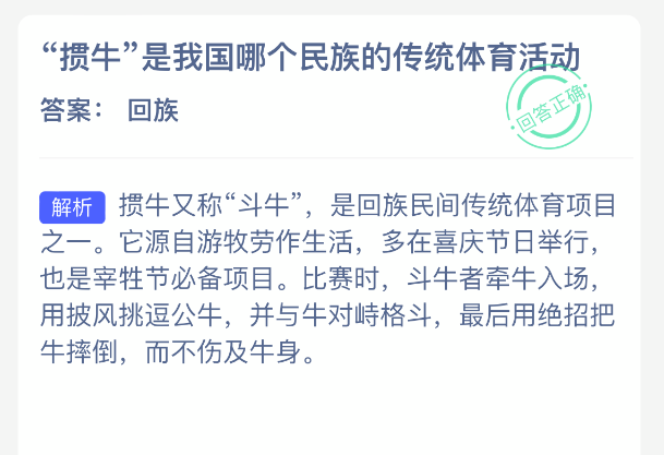 “掼牛”是我国哪个民族的传统体育活动?【蚂蚁新村每日一题】2025年12月4日题目已发布!坚持答题,积累木兰币,即可加速小镇建设。答对本题,立即可享“产速+3/时”的加速奖励!今天正确答案是【回族】。掼牛又称“斗牛”,是回族民间传统体育项目之一。