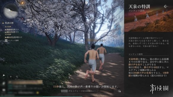 该活动被在国际服称为“天泉特训”。作为游戏内众多包含多人互动要素的活动之一,玩家需跟随 NPC“天泉弟子”从仙之港一路奔跑到忘仙乡。引人注目的是,领跑的 NPC 们造型独特——男性角色仅着短裤,女性角色仅裹浴巾。一旦玩家加入该特训,其角色外观也会被强制替换为同样的“半裸”装束。