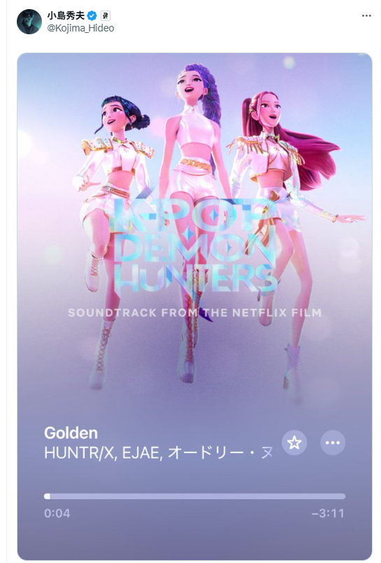 小岛秀夫在 X 上提到自己是一时兴起才会去看《Kpop 猎魔女团》,结果整个人直接入迷,看到最后还感动到哭出来。随后更是贴出一张正在听该剧最热门的音乐“Golden”截图,不难看出来这位传奇游戏制作人也难挡这股席卷全球的虚拟女团热潮。