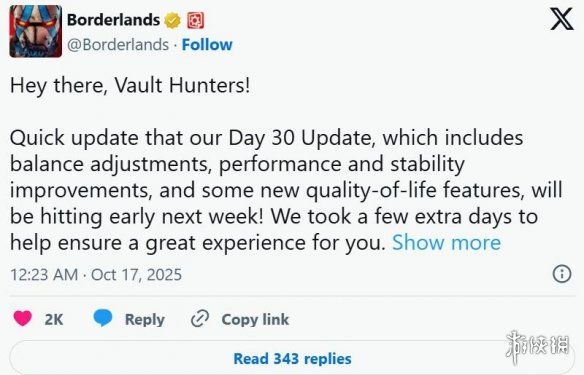 目前暂未得知该更新将于何时实装,Gearbox仅透露预计将在“下周初”发布。回顾以往,游戏更新多安排在周四进行,但从此次开发团队的暗示来看,补丁很大可能提前至下周一或周二上线。
