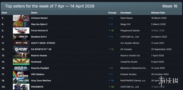 4月7日至14日的最新Steam游戏销量周榜揭晓(本次统计不含免费游戏)。本周,《红色沙漠》延续强势表现,力压《杀戮尖塔2》实现四连冠,持续领跑销量榜。