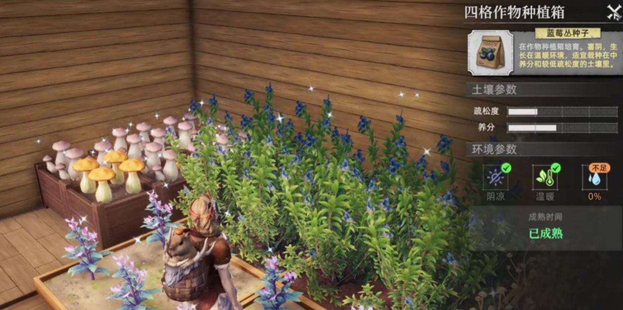 除了在水分方面需要玩家们实时关注,不同的植物进行种植时还要注意它本身所需要的土壤,有一些植物需要的是泥土加上草木灰,而又有一些植物需要的是泥土加上粘土的类型,例如覆盆子他需要的就是2份泥土加粘土或者是3份泥土,而更有甚者,例如海澜草需要泥土加蚯蚓加腐殖土,条件会更多,不过如果能够满足这些植物的需求,玩家们就可以实现完美种植,这样玩家们在种植的时候成功率也会直线上涨,在种植时,阳光方面也需要玩家们依据植物的需求来进行放置,对阳光需求高的需要将它放在室外才能很好生长。
