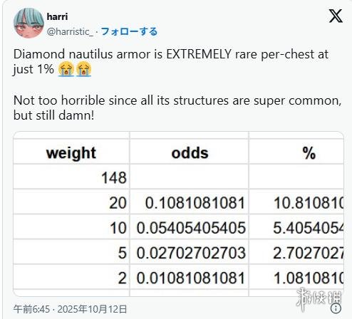 此次更新终于允许玩家驯服并装备在水下的新宠鹦鹉螺,为了保护这个脆弱的小家伙,官方贴心地设计了五种材质的“鹦鹉螺铠甲”。其中最顶级的“下界合金鹦鹉螺铠甲”获取流程极为繁琐,玩家需要先获得“钻石鹦鹉螺铠甲”,再配合锻造模板和下界合金锭进行升级。真正的噩梦在于那个前置的钻石甲——它只能通过海洋沉船、海底神殿或埋藏的宝藏箱子开出。据民间数据大神实测,其掉落率仅约为惊人的1.1%。不少玩家跑遍了半个服务器的海洋群系,连个铁甲的影子都没见着,更别提钻石版了,这让许多以全收集为目标的强迫症玩家直呼汗流浃背。