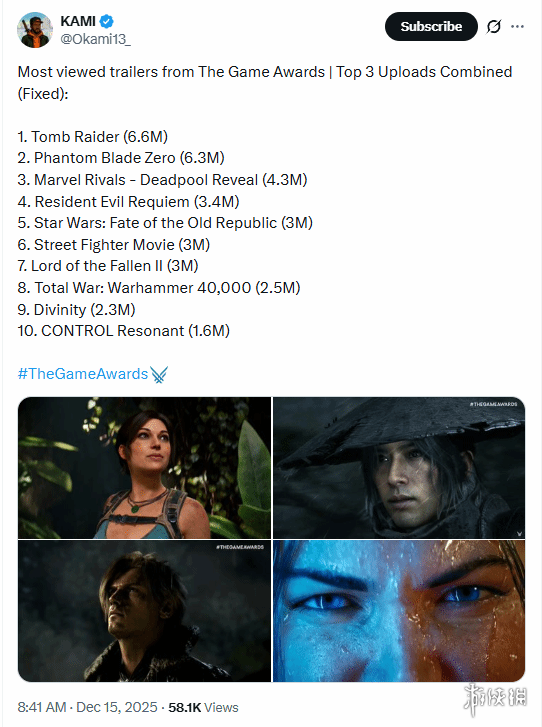 12月15日,推特游戏博主@Okami13_整理并公布了TGA2025年度游戏颁奖典礼期间播放量最高的十大预告片。其中排名第一的是《古墓丽影》系列的两支预告片,合计播放量达到660万次。