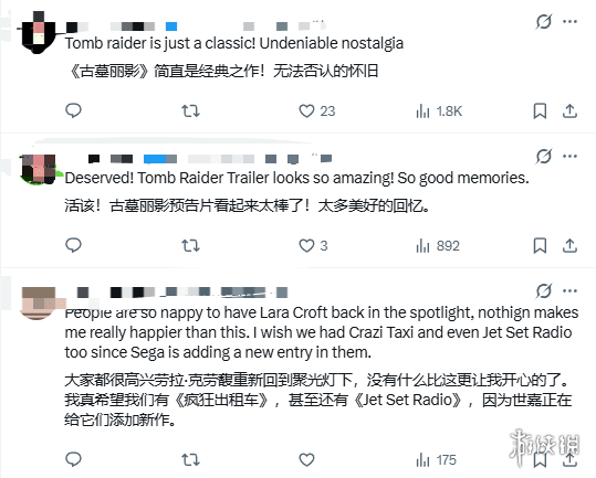 对于这一播放量数据,部分玩家感慨《古墓丽影》系列回归势头强劲,夺得榜首实至名归;也有玩家对《影之刃零》预告片的精良制作十分赞叹,对游戏的正式推出表达了期待。