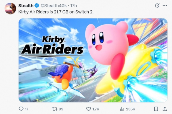 《星之卡比》正统续作《卡比的驭天飞行者》即将在本周正式发售,游戏的容量也在近日曝光。根据推主@Stealth40k的消息,本作在Switch 2上的大小为21.7GB。