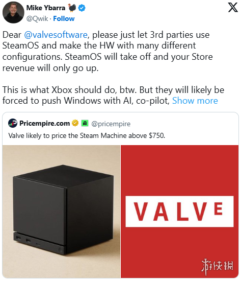 前Xbox高管、暴雪总裁迈克·伊巴拉近日提出,V社的前进方向应是向第三方开放SteamOS系统,允许其打造各类Steam Machine硬件。针对当前关于Steam Machine售价可能高于预期的传闻,伊巴拉在推特上直接喊话V社:"请让第三方厂商使用SteamOS来制造多种配置的硬件。SteamOS将因此腾飞,你们的商店收入也会水涨船高。"值得肯定的是,V社此前已允许联想在今年初推出Legion Go S SteamOS掌机,但第三方Steam Machine主机目前仍未获官方确认。