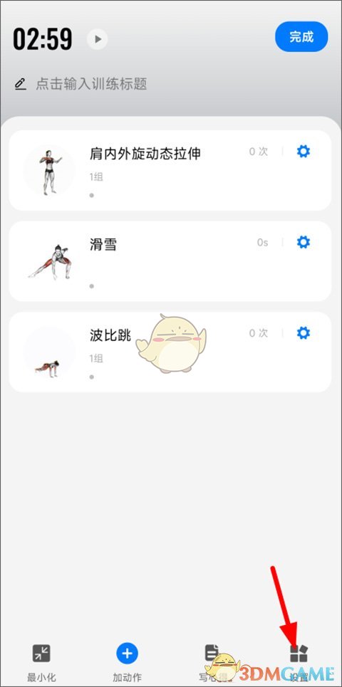 2、进入计划页面,用户可看到自己的训练标题和动作,点击右下角设置;