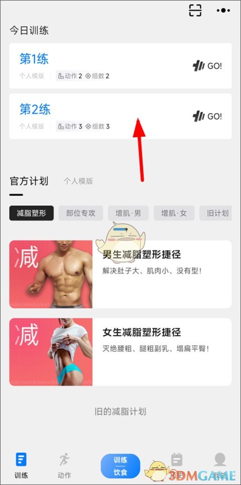 1、用户打开训记app,在训练首页看到今日需要锻炼的计划,点击打开计划;