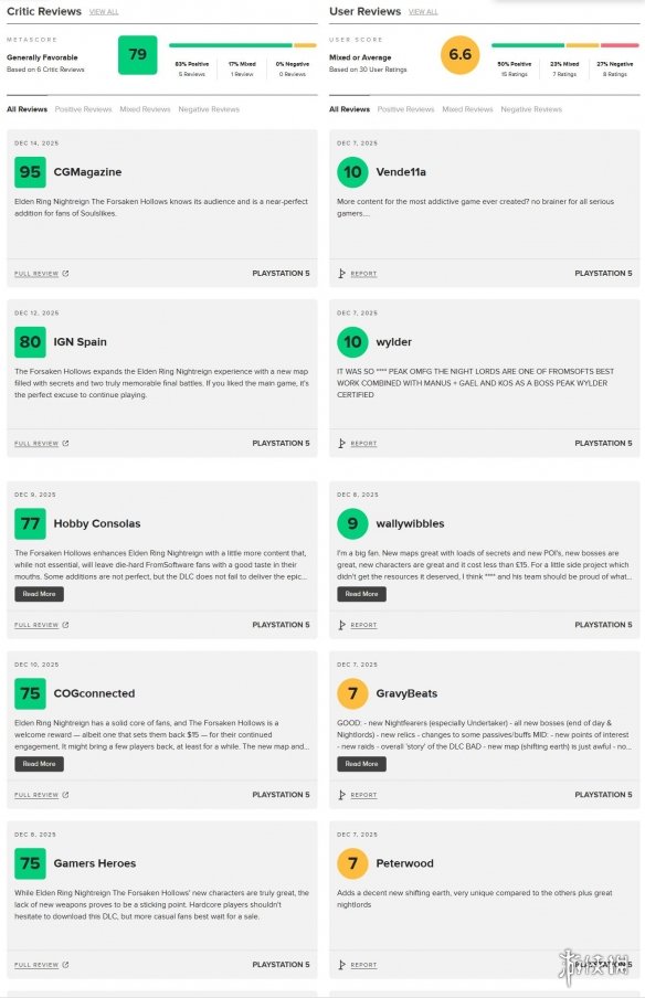2025年12月4日,备受瞩目的共斗生存动作游戏《艾尔登法环 黑夜君临》正式推出了首个DLC“见弃空洞者”。根据权威评分网站Metacritic的最新统计,截止发稿时,该DLC的PS5版本基于6家媒体评测,获得了79分的综合评分。尽管有评论指出本次更新在内容体量上不够“量大管饱”,特别是新武器的缺席令人遗憾,但凭借其对“魂系”受苦精髓的精准把控以及极具压迫感的BOSS设计,这款扩展包依然赢得了核心粉丝群体的广泛认可。