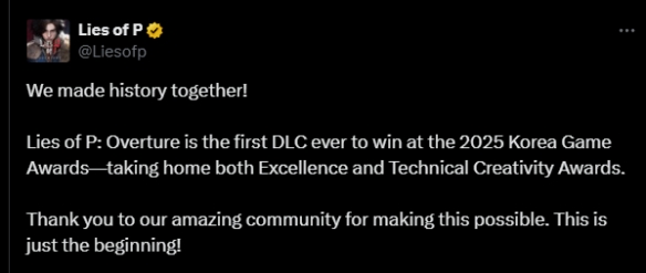 近日,2025韩国游戏大奖正式揭晓,《匹诺曹的谎言:序曲》荣获史上首个获奖的DLC,斩获了优秀作品奖与技术创意奖。