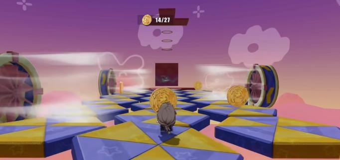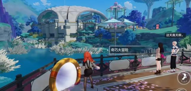 通常是先要去地图找上可以交互的物件,可以交互会弹出“奇巧大冒险”的互动条。有一些区域的关卡则有点难度,比如说一些跨度很长的跳板,则需要向前走然后一段跳再按住必杀技按键进行缓慢的降落。