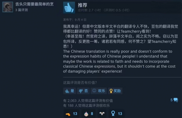 此次更新是对此前社区反馈的积极回应。早前,游戏在Steam平台的简中评测一度为“褒贬不一”,大量玩家集中批评其翻译质量,称文本“半文半白、难以理解”,更有玩家直言某些任务说明(如“九钟响时运送:二十节又两奏烟岩”)令人费解。此外,社区还发现翻译中存在使用和制汉字、字体显示不够清晰等技术性问题。