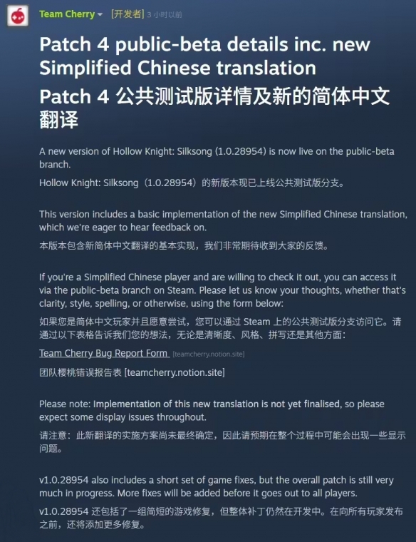 玩家现可通过Steam客户端,在游戏属性中选择参与测试版以体验此次更新。不过团队也强调,当前翻译版本仍非最终成品,可能存在文本质量问题,欢迎玩家在体验过程中通过官方渠道反馈各类问题。