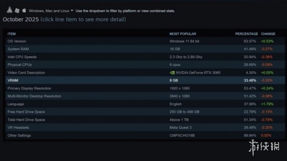 尽管V社宣称Steam主机性能是热门设备Steam Deck的六倍,但工程师Yazan Aldehayyat在Adam Savage's Tested频采访中透露,2026年问世的这款设备至少与70%Steam用户的平均配置持平甚至更优。其设计标准源自Steam月度硬件调查数据——根据2025年10月统计,最主流配置为Windows 11系统、六核Intel处理器配RTX 3060 8GB显卡、16GB DDR4内存及1-2个1080P显示器。