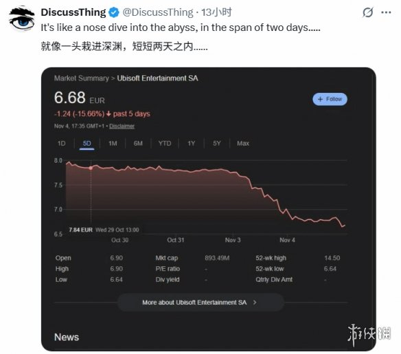 而就在近日,育碧股价再度遭遇重挫,走势犹如“巨兽失足坠入深渊”,持续引发市场关注。