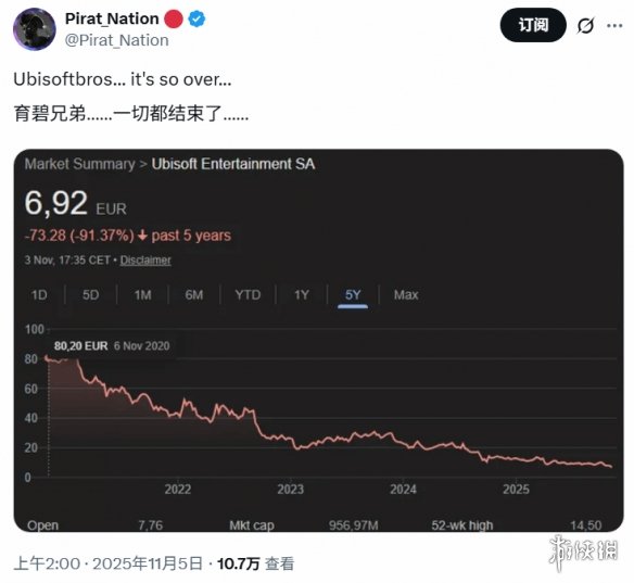 近期,游戏领域知名推主Pirat_Nation公开了育碧近五年股价走势数据,显示其市值已缩水近九成,这一剧烈波动令众多玩家震惊不已。